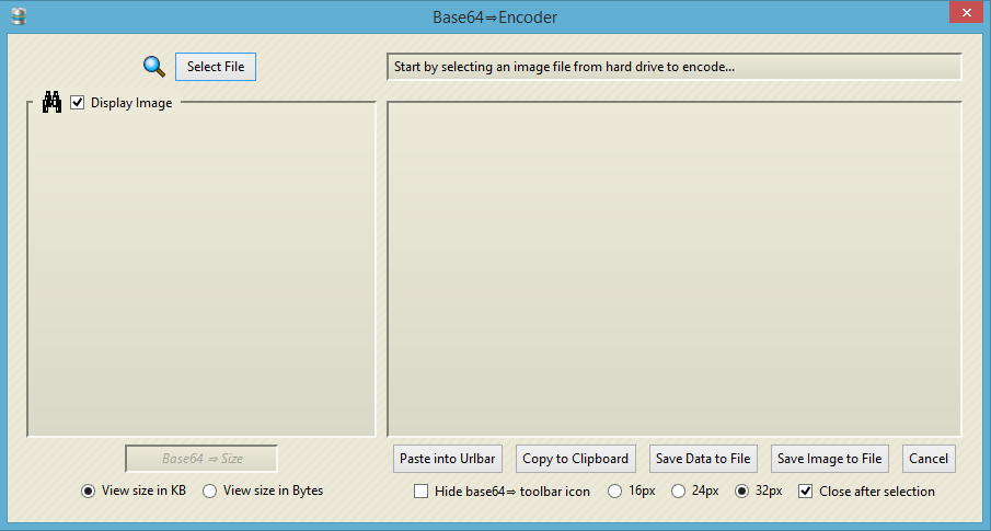 Converts image files on hard drive and web page src images into base64 data. Right-clicking on target image in web pages displays menuitem 'Base64 Encoder' in contentAreaContextMenu only if target image is an src type. Options to save image as data file or save as image via filepicker, copy data to clipboard or paste data into urlbar. Also contains a viewer that displays the width/height and size of image in bytes or kbytes.