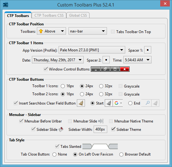 Creates 2 custom toolbars with options to toggle/position, manipulate menubar and sidebar, toggle toolbar icon size, display document title/profile name/version/date/time, tab options, insert an searchbox clear field button and set css parameters. Homepage/Website: https://sonco.synthasite.com/