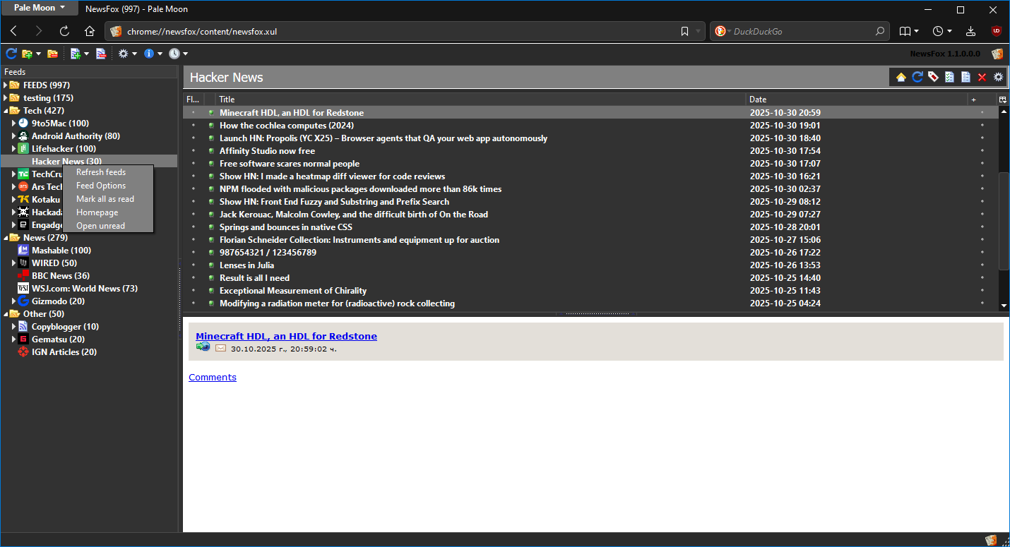 NewsFox is an efficient 3-pane (email) style Atom/RSS feed reader. NewsFox allows you to group your feeds as you wish, read feed content offline, update feeds when you want, 1-click subscribe with the Pale Moon URL bar icon, and read other feeds while updating.